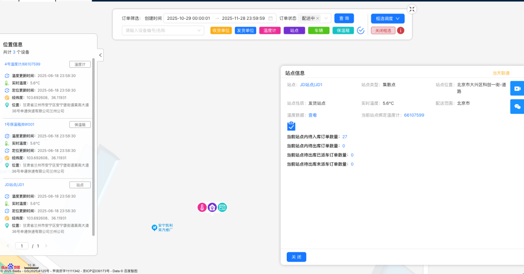 此次更新中,SCMsafe链四方在订单地图中持续强化运输过程的实时呈现能力,不仅新增温度计详情展示,还进一步丰富了保温箱、站点等关键节点信息,并支持订单跟踪与设备定位的自动刷新。